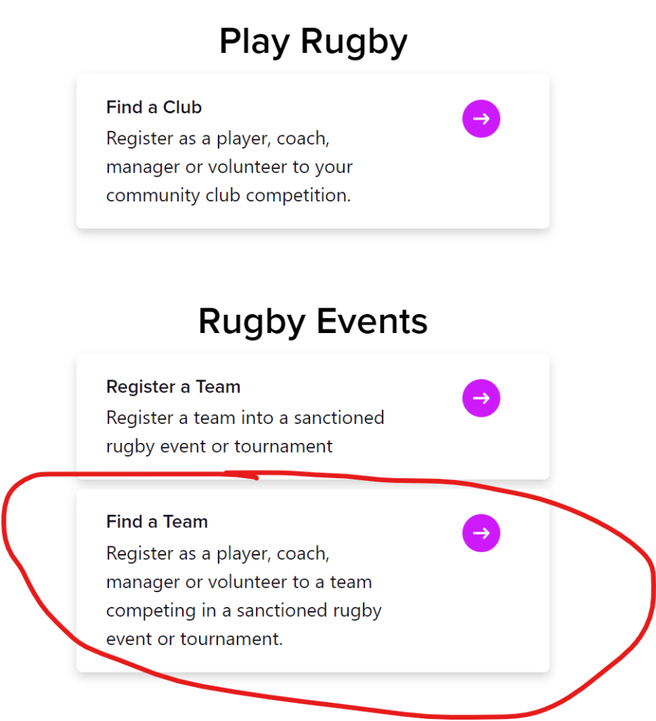 Your participants need to either use the RX App or go to the RX Portal (https://myaccount.rugbyxplorer.com.au/) to register. They should use Find a Team (circled in red).